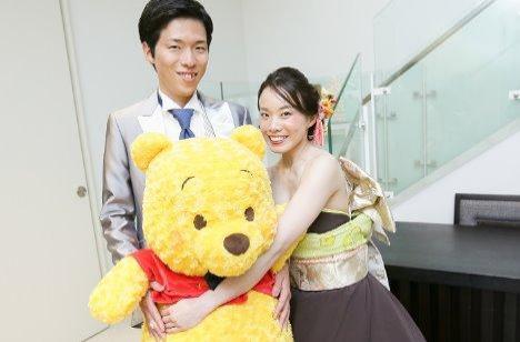ディズニーがお好きなおふたり!中でもプーさんがお好きでした!大きいプーさんと真っ白なウェディングケーキが一緒に登場し会場が大いに盛り上がりました!真っ白なウェディングケーキにはプーさんにも登場するミツバチたちが可愛らしく装飾されており、仕上げとしておふたりにはソースをかけていただきオリジナルのウェディングケーキが完成いたしました!
