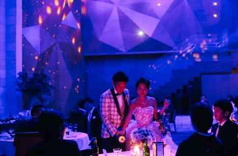 結婚式のお打合せを進めさせていただく中でおふたりがやりたい!とおっしゃっていただいたのがキャンドルサービスでした。プロジェクションマッピングも使用しながら会場の照明もしっとりとした雰囲気にして1卓1卓おふたりで灯りを灯していただきました。近くで皆様からお祝いのお言葉をいただいたおふたりはとても柔らかい表情で皆様のテーブルを進まれました。