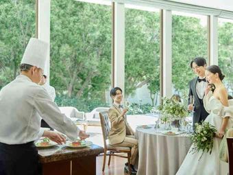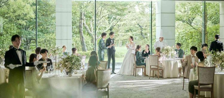 雨でも安心の全天候型チャペルは、自然光がやさしく降り注ぎ、緑が美しく映える特別な空間です。ゲストに囲まれながら、天候に左右されずに心温まる誓いを交わせます。光と緑に包まれたチャペルは写真映えも抜群で、挙式のひとときがより一層鮮やかに記憶に残ります。