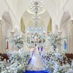 【感動の挙式料30万円相当プレゼント&独立型大聖堂で彩る特別な日】ステンドグラス輝く本格的な大聖堂にはドレスが映えるロイヤルブルーのバージンロードと圧巻の13mの天井高。海に囲まれフラワーシャワーも。