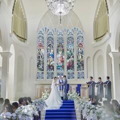 【人生で最も特別な日を彩る】たった"一日"しかない結婚式だからこそ"一生"の想い出に残るように。ステンドグラスが輝く本格的な大聖堂にはドレスが映えるロイヤルブルーのバージンロードと圧巻の13mの天井高