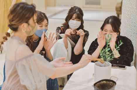 ウェルカムスペースには、「植樹の儀」の演出を取り入れました。木のスプーンを使って、オリーブの樹が入った植木鉢にゲストから土を入れてもらうというもの。ゲストも楽しみながら参加してくれたようです。雄と雌の木があわさって実をつけるオリーブは“幸せを呼ぶ木”や“夫婦の木”と呼ばれ、ウェディングシーンで用いられることが多い植物。完成したオリーブの鉢は、ご新郎ご新婦の新居で大切に育てているそう。