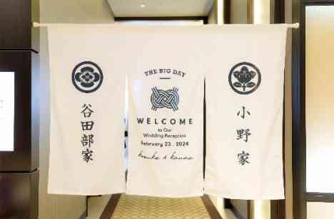 披露宴会場のウェルカムスペースは自由に飾り付けができ、おふたりらしさを存分に出すことができます。和の雰囲気も出したいと考えていたおふたりは、エレベーターを出てすぐの通路にオリジナルの暖簾を装飾しました。 両家のお名前が記載された暖簾は、『家族』の繋がりをイメージさせ、ゲストの皆様の人気写真スポットにもなりました。