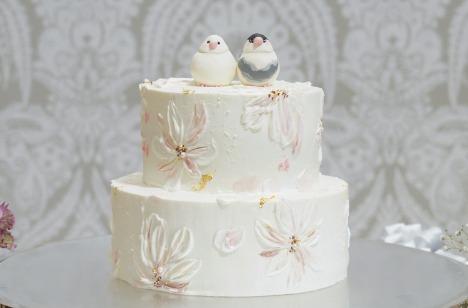 新婦様の「ご実家で飼っていたペットの文鳥をモチーフに、おしゃれなケーキでお願いします」とご希望をお伺いまして、イメージ写真ですり合わせをしながら出来上がったこだわりのオリジナルウェディングケーキ!想像以上に素敵で、おふたりも親御様も大変喜んでおりました。サンクスバイドでもゲストにたくさんお写真を撮られまして大活躍でした。