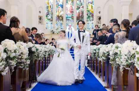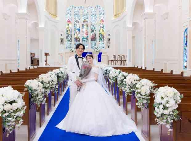 チャペルでの教会式に憧れていたというご新婦。天井が高く開放感のある大聖堂で、多くのゲストに囲まれながらロイヤルブルーのバージンロードを歩く感動的な挙式を叶えられました。 入場の前にはご両親宛のメッセージを添えたムービーを上映し「感謝の気持ちを伝えることを大切にしたい」というおふたりの想いに沿った演出になりました。おふたりも「心に残る素敵な時間だった」と、生涯の宝物となる時間を過ごされたようです。
