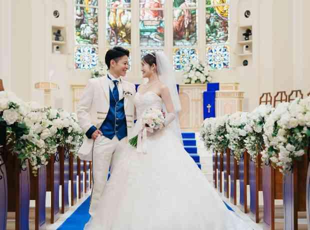 ゲストの動線を考えて建物が設計されているため、移動がスムーズに行える当館。チャペルは天候に左右されない造りで、安心して当日を迎えていただくことができました。バージンロードは鮮やかなロイヤルブルーが特徴で、ご新婦が自身の骨格と雰囲気に合うと選ばれた、キラキラと輝くラメ感のあるウェディングドレスのトレーンが美しく映えるひと時に。ゲストの皆様からは「とても綺麗だった」との声が寄せられていました。