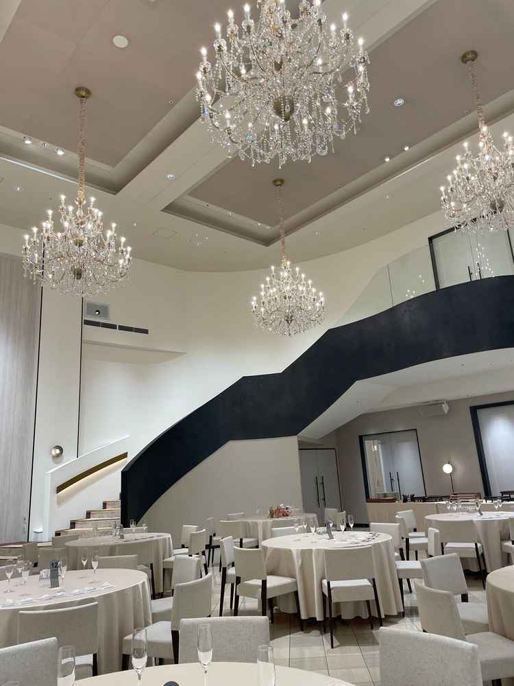 大きなシャンデリアがいくつかある会場を見学したのですが、天井もすごく高く素敵でした。新婦のドレスが見えるようにガラスになってる柵があったりしたのがよかったです!
