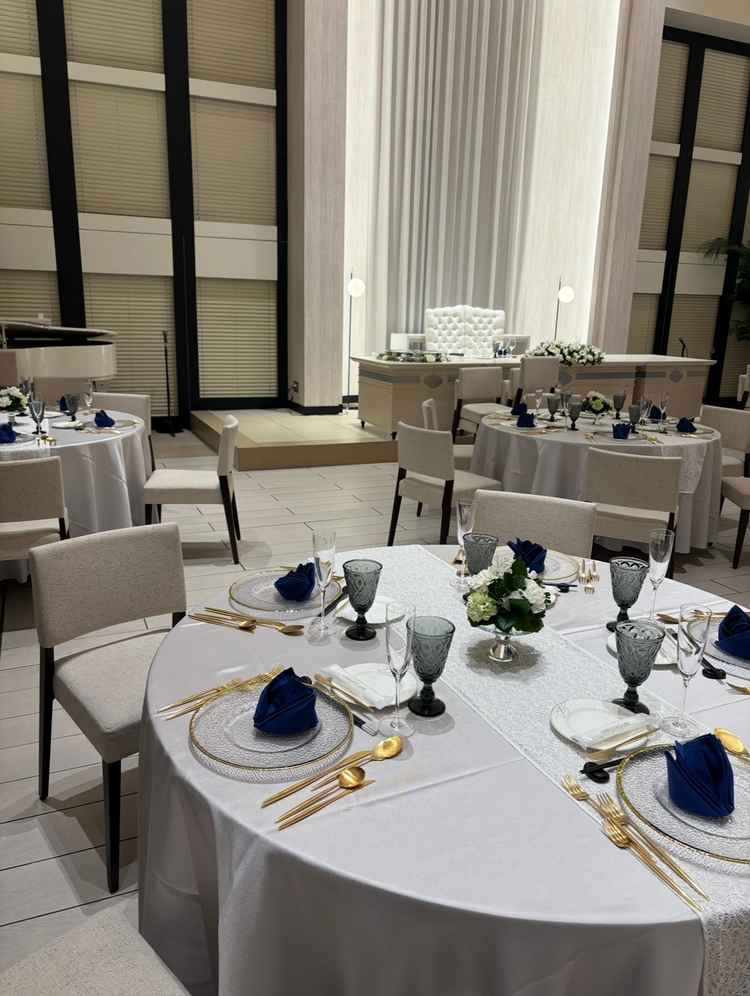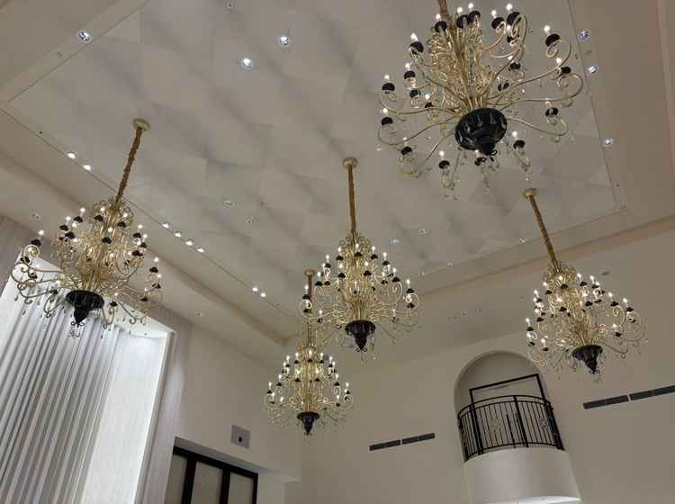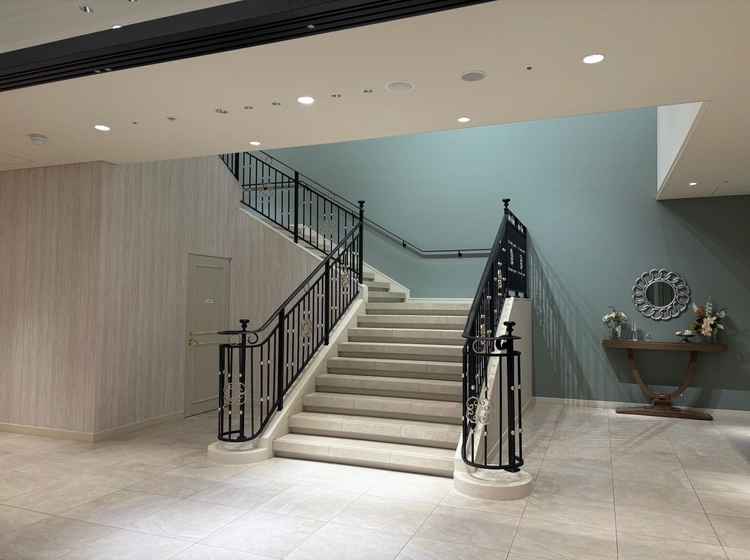 披露宴会場には2階部分や階段もあったり、ゴージャスなシャンデリアもあってとても華やかでした。 実際に式の合間に見学したのでスタッフの方たちが慌ただしく仕度しており、演出や照明などを見ることはできなかったです。