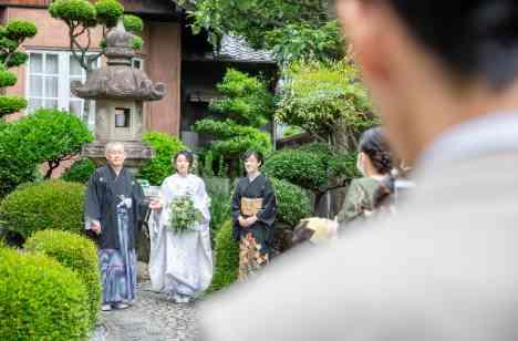 開放的な空の下、石畳での和装人前式。おかあさまからの紅差しの儀。今までを思い返し、おかあさまと新婦さまのふたりだけの特別な時間。その後袴を着られたお父さまとのご入場。セレモニーの結びには、おふたりからの感謝の気持ちを綴って、届ける心綴式。心を込めておふたりからお手紙を読んでもらい、ゆっくりくつろいでほしくて、旅行券を贈呈されました。