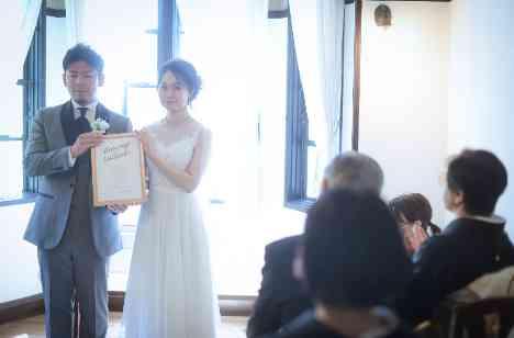 一軒家の明るい光の差し込む室内チャペルで、ゲストの皆様を前に誓いを立てる人前式をセレクト。お父様とのご入場は、照れながらも、楽しみにされていたご様子で新郎様のもとまで。誓いの言葉は、おふたりで考えられ、家族を前に、永遠の愛を誓われました。家族一人一人の顔を見ながら過ごす時間は、印象的で忘れられない時間となりました。