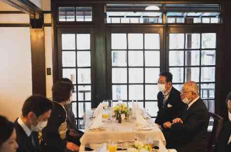 会食時間は、少人数ですが、家族ごとにテーブルをセッティングして、リラックスして過ごせる空間づくりを。とにかく、緊張感なく過ごしてほしいからというおふたりのご希望。おふたりもすぐ近くにテーブルをセッティングし、お料理もしっかり召し上がりながら、ゲストと座りながら会話も楽しめる。まるで、家族で食事にきたかのような、いつもと変わらない時間をお過ごしにになりました。