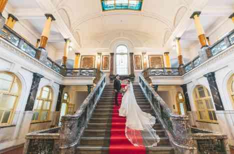 おふたりがセレモニーの場所として選んだのは、名古屋市市政資料館は大正11年に建てられた、ネオ・バロック様式のレンガ造建築物。国の重要文化財にも指定されている特別な場所。中央階段や、ステンドグラスが印象的で、訪れたゲストにとっても忘れることのできない、特別な場所に。一歩一歩上がる中央階段を上がった先にみえる景色はゲストを感じることができ、どの瞬間も忘れることのできない特別な時間に。