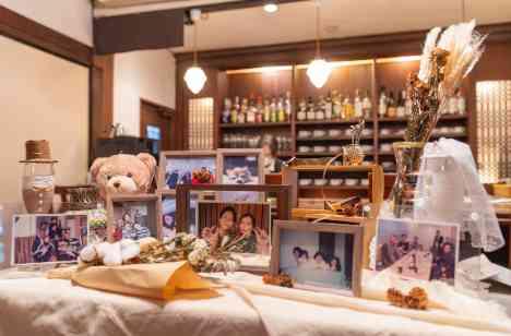 お互いの家族同士が揃い、美味しい食事を囲みながら、絆を深めるための時間になるように、まずは両家の家紋入りの暖簾でお出迎えし、レストランに入ると、小さいころからの想い出やおふたりの想い出のお写真やアイテムコーナーをセッティング。派手な演出がないからこそ、ゲストに想いが伝わるよう、おふたりが事前にご準備を。