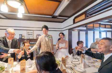 乾杯♪おふたりを囲んで過ごす会食スタイル。少人数で過ごす時間に、プロの司会者も不要で、おふたりとゲストが心地よく過ごす時間。何かを進めていくことよりも、じっくり想いを通わせあう時間に。ゲスト一人一人との写真を撮影したり、ゲスト同士の記念写真を撮影したり、おふたりの結婚式という機会がゲストのつながりを絆を深める時間に。