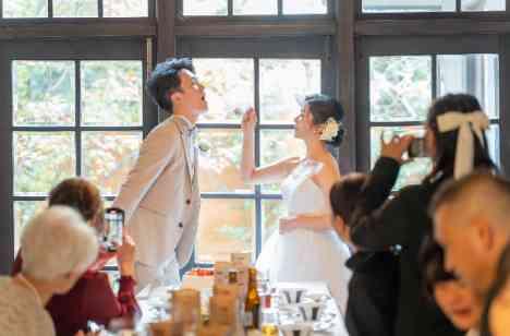 ゆったりとおふたりを囲んで、ゲストと美味しい食事とお飲み物を楽しんでもらい、おふたりの想い出話に話も弾むけれど、それだけでは、物足りないかな。と心配されていたおふたり。おふたりとゲストとの小さくてかわいいウェディングケーキ入刀のシーンは、おじいちゃんもおばあちゃんもカメラをもっておふたりのもとに。なかなか写真を撮らないみなさまもこの時ばかりは、記念にと頑張る姿がとってもチャーミング。