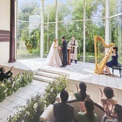【開放感溢れる森の大聖堂】天井高8mの森の中にいるような自然溢れる雰囲気と、ゲスト席より高い位置にあるからこそ花嫁を美しく見せるバージンロードに注目!祭壇の奥にも濃い緑が溢れているためドレスも映えます
