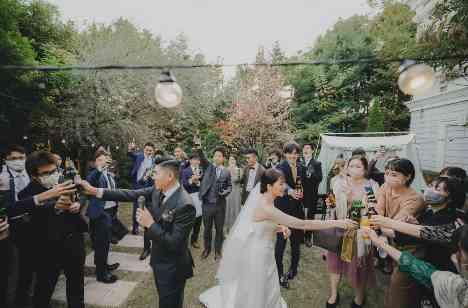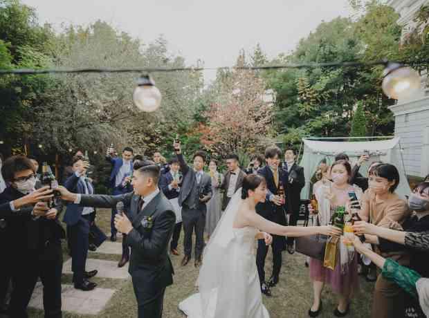 メインテーブルで行う乾杯もいいけれど、ガーデンでゲストの皆様に新郎新婦を取り囲んでもらった状態で行うガーデン乾杯もとっても素敵です。 横浜にあるとは思えない、本物の緑に囲まれながら、みんなで「乾杯!!」。 ゲストも「こんなの初めて!」と驚きながら、新郎新婦とのおしゃべりを楽しんでいただきました。