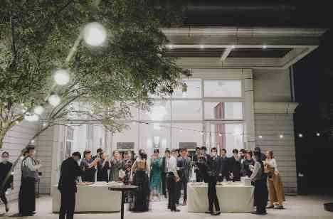 日が暮れた後のガーデンは、また違った表情になります。 カーテンが空いたら、ライトアップされたガーデンが。 そこにフードやデザートを出して、フリータイムをとりました。 お二人の装飾であるテントなどのキャンプグッズも、夜のガーデンとマッチして雰囲気を演出してくれました。 お酒を片手に新郎新婦とゲストが近い距離で交じり合う、素敵な時間になりました。