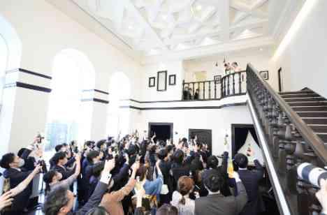 披露宴はみんなで楽しむパーティ! はじまりはロビーを使っての盛大な乾杯です! みんなで声高らかに「乾杯!」。 その後は新郎新婦もゲストの輪の中に入って、フリータイム。新郎新婦とゲストが近い距離で、おしゃべりしたり、写真を撮ったり。 披露宴のはじまりに、距離が縮まる時間を創ったことで、会場は早くも熱気に包まれました!