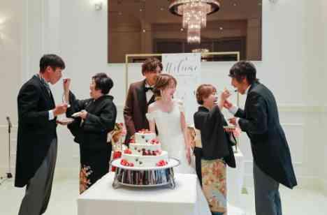 披露宴もとびきり自由に! 新郎新婦様だけが輝く披露宴ではなく、ゲストにもスポットライトがあたるお時間にしていただきました。 新郎新婦様のファーストバイトの前に、誰よりもお世話になったご家族様に、お手本を!とても和やかなお時間となりました。 ケーキセレモニーひとつでも、いろいろなアイデアでお二人らしさを演出します。