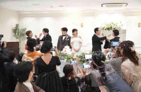 ご家族が大好きで仲良しなおふたり。 これから目指していく夫婦像を想像した時に、ご両家の親御様が思い浮かびました。 当日はサプライズで親御様をお呼びし、お手本バイトを行っていただきました。 息ぴったりの親御様のバイトの後は親御様に見守っていただきおふたりのファーストバイトを行いました。 ご家族同士お写真撮影をしているお姿もとっても素敵でした。