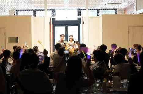 人気のイベント「ドレス色あてクイズ」にプラスして、ご新郎様のシャツの色あてクイズも行いました! ご新婦様手作りのフラッグを一色ずつ選んでいただき、再入場のタイミングでペンライトとともに掲げていただきました。 会場一体となりおふたりをお迎えし、その後のプレゼントをお渡しするお時間も最高潮に盛り上がりました!