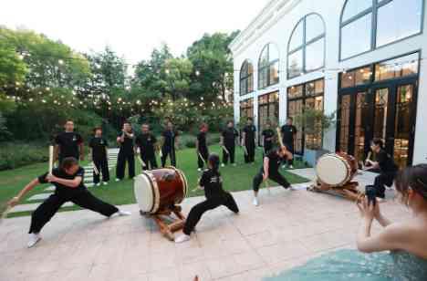 和太鼓を通じて出会われたおふたり。 当日は太鼓教室のメンバーも多くご列席されました。 一台の太鼓を両サイドから叩くスタイルで、あまり見ることのないスタイルにゲストも大興奮! ご新郎様も飛び入り参加しこの日一番の盛り上がりに!! 緑に囲まれた自然いっぱいの空間で大迫力の太鼓の音が鳴り響きました。