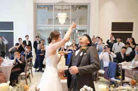 ケーキ入刀後は、サプライズでおふたりのご兄弟ご夫婦にご登場いただきお手本バイトを見せていただきました。 息ぴったりに同時に行うバイトの後はいよいよおふたりの番!! まずはご新郎様からご新婦様へ。 可愛らしい一口サイズのケーキを運んだ後は、Bigスプーンでご新郎様へのバイト! 愛情いっぱいすくったケーキに思わずのけ反るご新郎様でしたが、しっかりと受け止め見事に完食されました。