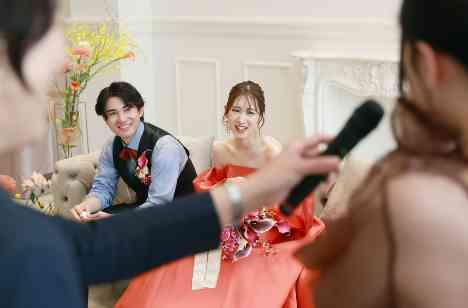 ご親族様以外のゲストは友人のみだったこともあり、あえて代表スピーチではなくインタビュー形式を行いました。各コミュニティからピックアップをして頂き、インタビュー内容もそれぞれ考えて頂き司会者と掛け合いの中お話頂きました。 友人たちからの言葉でお二人だけではなく、ご親族様の笑顔が溢れた時間となりました。