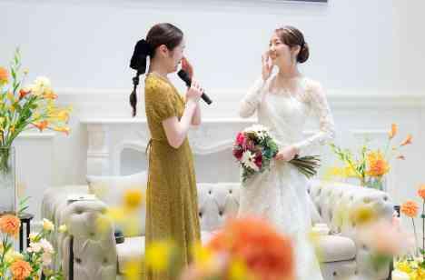 ご披露宴中盤、お色直しのためのエスコート役を当日サプライズで妹様をお呼びしました。 とても雰囲気が良かったので急遽コメントもいただき、どんなお姉様かを伺い、ゲストの皆さまへお話をしてくださいました。 突然のお願いではありましたが、日頃の想いがあふれ、ご新婦様も妹様も涙があふれ、とても温かい時間になりました。