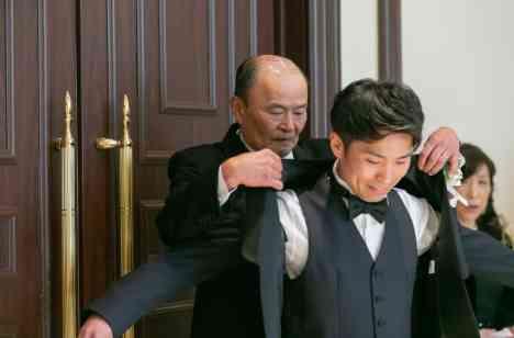 新郎新婦お二人とも、親御様への感謝やおもてなしを重視していたお二人。 とくに新郎はご家族ともとても仲が良く、新婦だけでなく新郎にもベールダウンに代わる挙式のセレモニーでジャケットセレモニーを行うことにしました。 ベールダウンには子育て卒業として親御様の手で身支度を整えるという言伝えもありますが、花婿にも親御様にジャケットを着せてもらい身支度を整えていただきました。