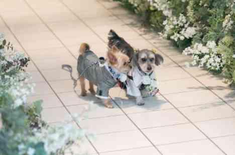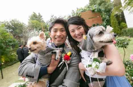 新郎新婦ともご実家に1匹ずつわんちゃんを飼っていらっしゃり、会場見学時からリングドッグをしたいとおっしゃっていた為、当日は2匹のわんちゃんに指輪交換の前にご登場いただき、指輪を届けていただきました。 また、2匹とも披露宴中はロビーで過ごしてもらい、ロビーに来たゲストに可愛がってもらったり、ガーデンで一緒に写真なども撮ってもらいました。 ペットも家族一員として終日一緒に過ごすことができました。