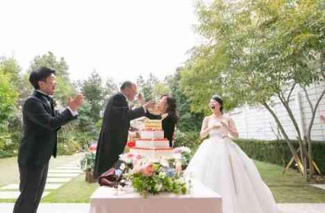 ウェディングケーキの入刀はガーデンにて行いました。なかなか披露宴中に新郎新婦と過ごし足りなかったゲストもガーデンでゆっくり過ごすことができました。 お足の悪いゲストの方用にガーデンにはソファを準備し、ご年配のゲスト様にもしっかりご覧頂くことができました。 ケーキ入刀後には、親御様に新郎新婦のお手本となって頂く為、お手本バイトを行いしとても暖かく素敵なシーンになりました。