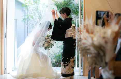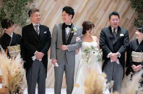 挙式ではご新婦様のベールダウンセレモニーだけでなく、ご新郎様のジャケットセレモニーも行ない、ご両家共に親御様にご参加頂くお時間をつくりました。今まで大切に育ててきて頂いた親御様にお二人の身支度を整え頂き、お二人の誓いの場である挙式がスタート致しました。