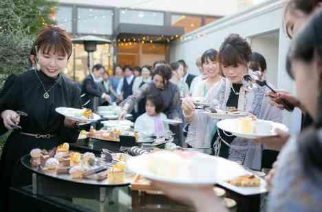 ガーデンを使い開放的な空間で、皆様と一緒に楽しむ事の出来るデザートビュッフェ。かわいくてオシャレなデザートが並び、ゲスト様も大変お喜びのご様子でした。お二人もフリータイムでご自由に、皆様とお話をしたりお写真を撮って楽しい時間を過ごしました。