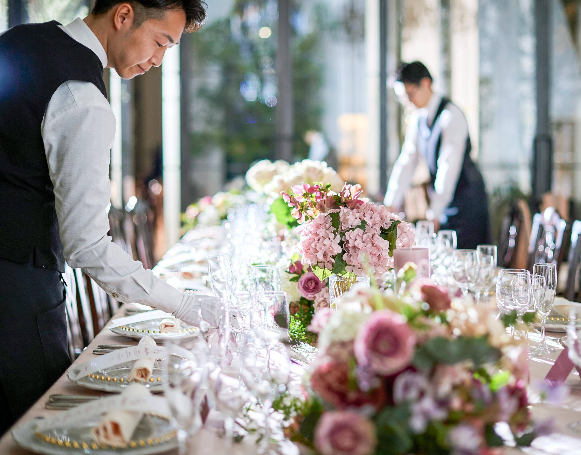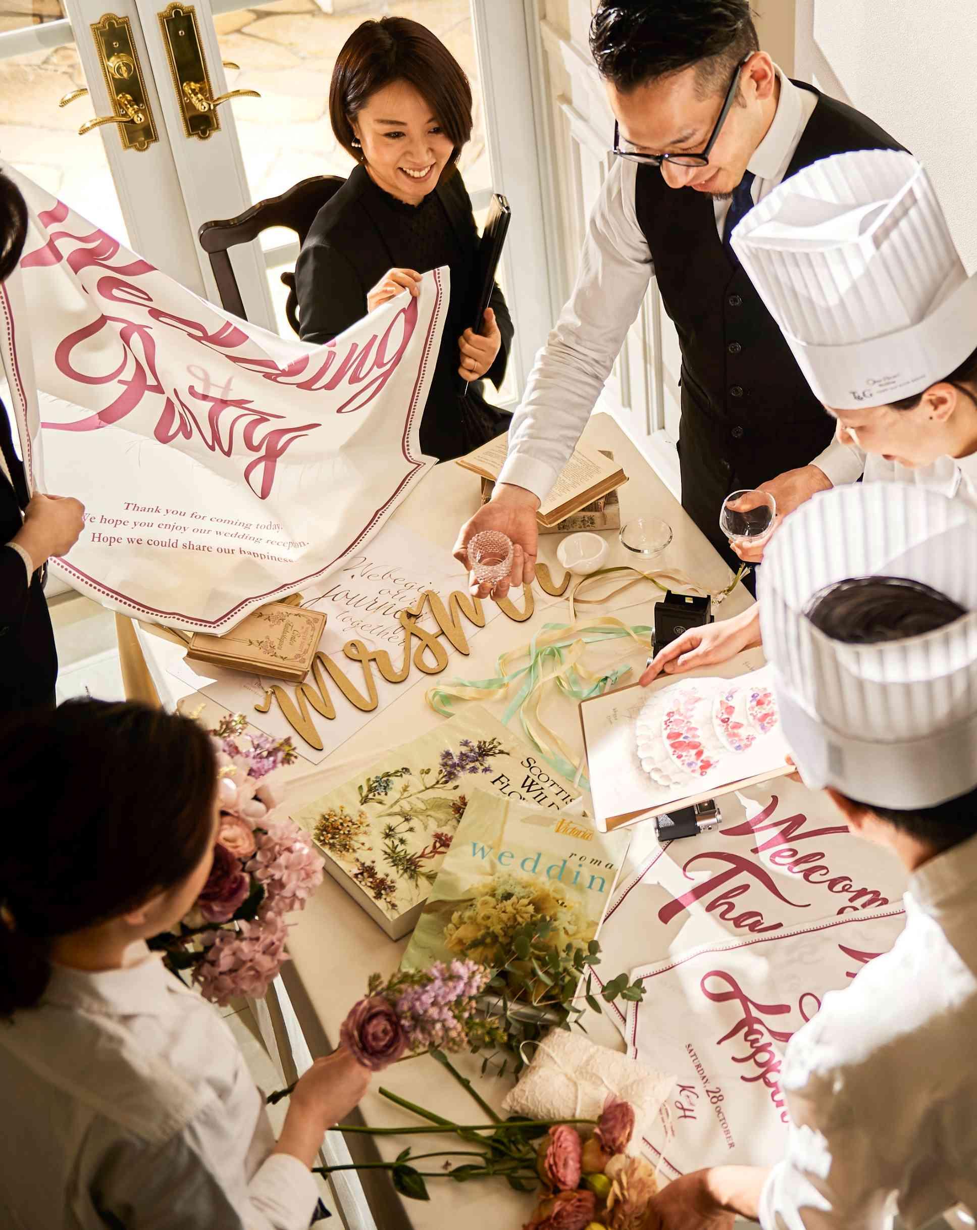 会場⾒学から当⽇まで同じプランナーが寄り添う「⼀顧客⼀担当制」で、ふたりの想いを丁寧にカタチに。各分野のプロフェッショナルがチームで連携し、ドレスやブーケ、空間演出までトータルサポートいたします