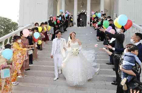 披露宴会場の雰囲気が好みだった事もそうですが、バージンロードの長さと他の式場にはない大階段からの景色に一目ぼれし、アンシェルデ・マリアージュを選びました。 結婚式当日は大階段でフラワーシャワーとバルーンリリースを行いました。みんなからのお祝いの言葉とバラの花に包まれ、憧れの景色を見ることができ、一生忘れられない思い出となりました。