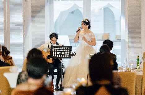 演出ではファーストバイトやご友人様のスピーチ、お色直しなどの王道な演出はもちろん、お二人からゲストの方に向けた歌のプレゼント演出を。ご新郎様は練習したギターをご新婦様は隣で美声を披露。結婚式という2人で作り上げる舞台の中で練習も含めてさらにお二人が作り上げるもう一つの時間。 自然と手拍子と拍手が起こりました。