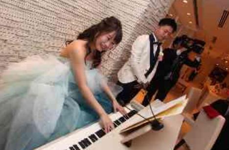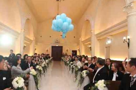 まるで、夢の国から黄色のクマさんが風船に揺られて指輪を運んで来たようなシーン。チャペルではゲストの方々にお手伝いいただいておふたりまで黄色のクマさんを導くように風船につながったリボンを前へ前へと運び最後はおふたりの薬指に。おふたりもゲストの皆さんもワクワクと笑顔があふれる感動的なシーンになりました。