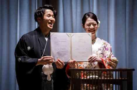 花嫁が入場するシーンの角度が最高で、ゲストからは横から見える形なのでバージンロードを歩く時の表情を長く見てもらえます。 一目惚れした古典柄の色打掛の横や後ろ姿の柄もしっか 見てもらえたことがとても嬉しかったです。 人前式にしたことで、ゲストの方を向き誓いの言葉を立てることができたので、緊張していましたが、ゲストみんなの顔が見られてホッとしました。