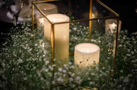 会場の『LUNA HALL』は黒を基調に会場全体が高級感のある作りで、バーカウンター、壁掛けの写真や置物、映像が流れているTVなど細やかな部分まで良さを感じました。 会場に合わせて、テーブルクロスも思い切って黒にしてみたところ、これがとても合いました。色を沢山使わずシンプルにしたことで、この会場の高級感が際立ったと思います。