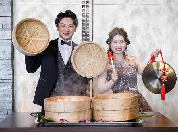 東天紅の本店なので、東天紅ならではの点心ビュッフェなどを追加で出していただくことができました。 全てのメニューでナイフとフォークを使わずに食事ができるので「気兼ねなく食べれた」とゲストにも好評でした。 ケーキはシンプルで面が綺麗なケーキが理想だったので、2段のケーキに金箔とルナリアというお花を縦1列に付けていただきました。