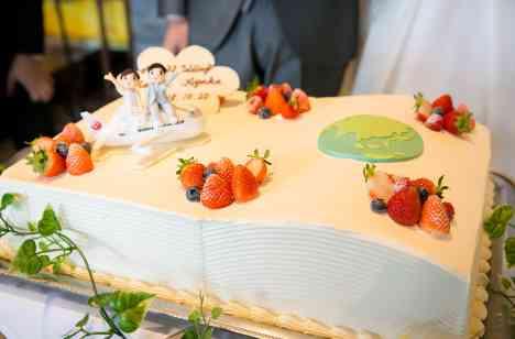おふたりのお好きな旅行をテーマにウェディングケーキを作成! おふたりをイメージしたお人形が飛行機に乗って旅行をしているシーンを再現したウェディングケーキになりました 地球儀の載ったガイドブック風にしているところもこだわりのポイント! ゲストの皆様にもお楽しみいただけるよう誰か当たるかドキドキのくじ引きバイトも行いとても盛り上がりました!!
