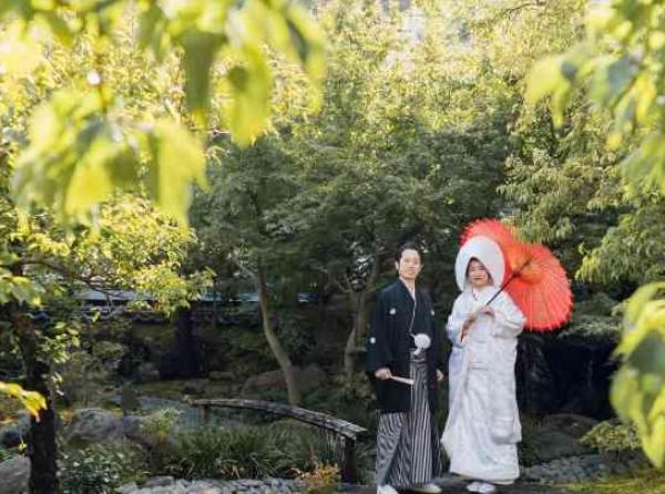 当日はお二人を祝福するかのような晴天にも恵まれ、緑鮮やかな庭園や朱色が映える太鼓橋など素敵なお写真をたくさん撮影できました。 ご友人もお二人の挙式を近くで見守りたい!と神社までかけつけてくれました。