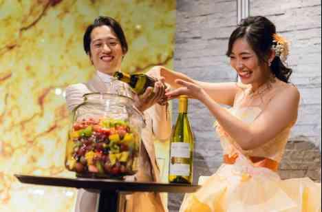 お色直し入場ではお二人がボトルを持ってゲストのテーブルをまわり中に色とりどりのフルーツをたくさん入れてもらいました。最後にお二人で白ワインを注いだらサングリアの完成です♪お酒好きなお二人ならではのゲスト参加型の演出はご親族、ご友人からも大好評でした!