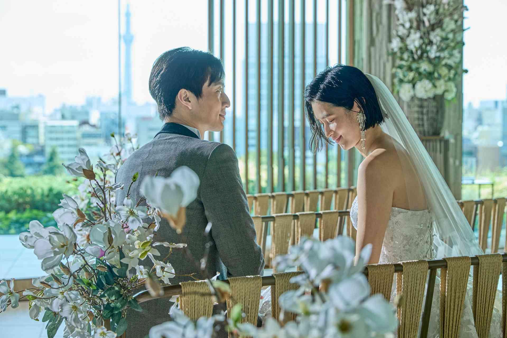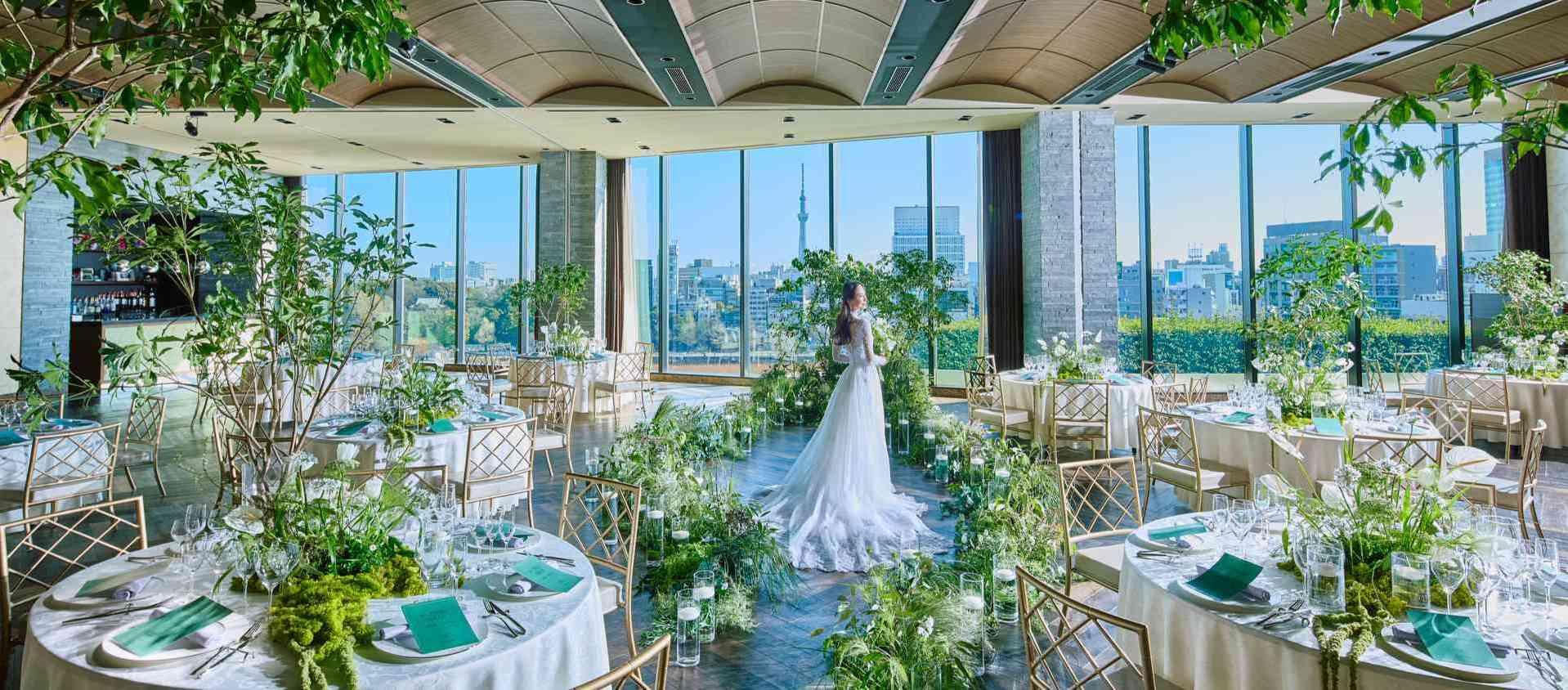 チャペル「LUCIS LORD」 光に包まれ挙式を執り行うこの空間は、円形だからこそ造りだせる一体感とあたたかさ 上野公園の緑と東京スカイツリーが広がり、自然と都市が融合した唯一無二のロケーション