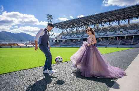 学生時代にサッカーを通じて仲を深めたおふたり。そんな思い出のサッカーにまつわる場所で前撮りをしたいとご希望があり、晴天の中サッカースタジアムでのロケーションフォトを行いました。非日常を感じるスタジアムでのロケーションフォトは、普段からニコニコのおふたりの笑顔も一段と輝いており、同行スタッフも一緒に楽しませていただきました。当時のユニフォームでの撮影もより一層思い出が深まりました。