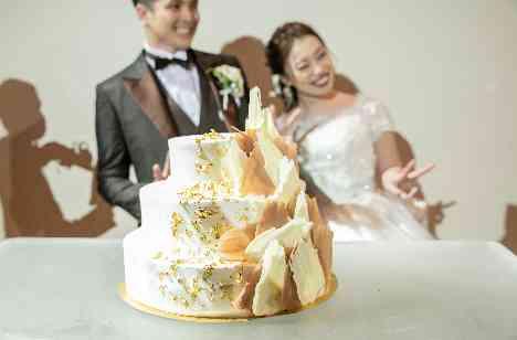 おふたりを祝福するゲストの皆さまからのサプライズに、会場中があたたかな空気に包まれたところで、おふたりからもこだわりのウェディングケーキでサプライズ!ホワイトのシンプルなケーキにブラウンゴールドの装飾を施したウェディングケーキは、登場した瞬間からゲストの視線を集め、会場中のカメラマンが集まりました。