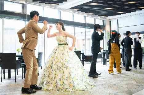 披露宴の入場はタキシードとドレスを着た新郎新婦が入場してくるかと思いきや、扉から現れたのはスノボのウェアを着た新郎新婦!実は担当プランナーとコーディネーターの替え玉入場で、急に曲が変わると新郎新婦のおふたりがテラスから登場!スタッフも一緒に新婦様が大好きなNissyのトリコダンスを踊っての入場サプライズに、会場内は大盛り上がりでした。