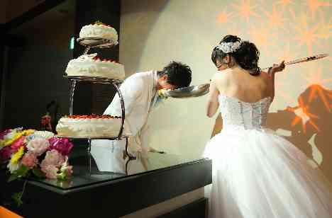 ”とにかくみんなに楽しんでほしい!”サービス精神旺盛で、普段から明るく周りを笑顔にすることが大好きなおふたりは、ファーストバイトも通常の「大・中・小」では物足りず、特注のBIGスプーンで! 愛情の大きさそのままに新郎さんのお口に運んでいただきました。インパクト大なシャッターチャンスもしっかり作り、会場は「もっともっと!」と大盛り上がりでした。
